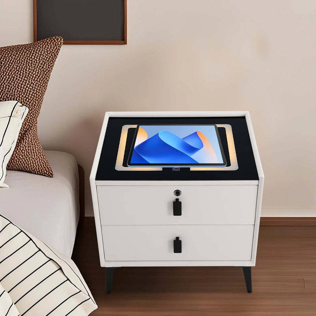 Bedside Table with Drawers, Bluetooth Speaker Smart Bedside Table with Light Usb& Wireless Charging